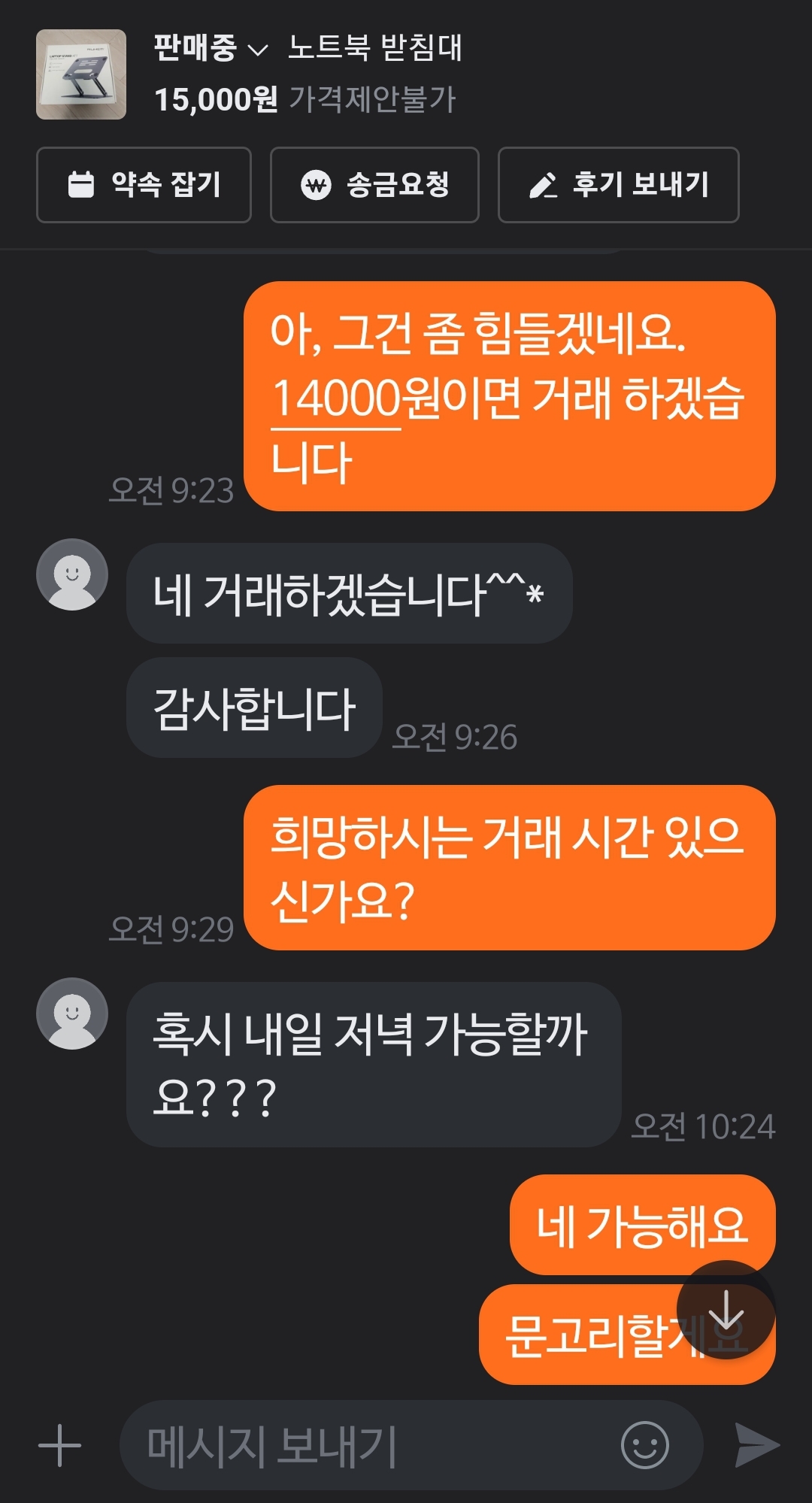최종적으로 제시한 가격은 14,000원입니다. 제시된 가격을 보고 정말 내가 잘한 선택이었구나 생각했는데요. 이유는 이미 판매를 했기때문입니다. 15,000원에 올려 놓았고 천원 할인해서 14,000원에 판매를 했거든요. ㅎㅎ
